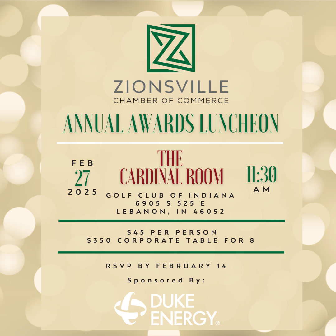 Join us at The Cardinal Room at Golf Club of Indiana for the Zionsville Chamber of Commerce Annual Awards Celebration, as we recognize the accomplishments of our business community.