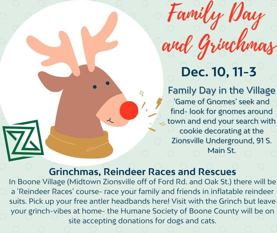 We will have two locations for activities for Family Day this year. In Boone Village we will have Grinchmas sponsored by Hometown Insurance. We will have Reindeer Games in the parking lot of Boone Village with the Grinch making an appearance for photos. In the Village we will have Game of Gnomes running with Cookie Decorating hosted by The Zionsville Underground for families to take part of. Please click the Registration button to let us know you are going to take part in the cookie decorating. See you there!