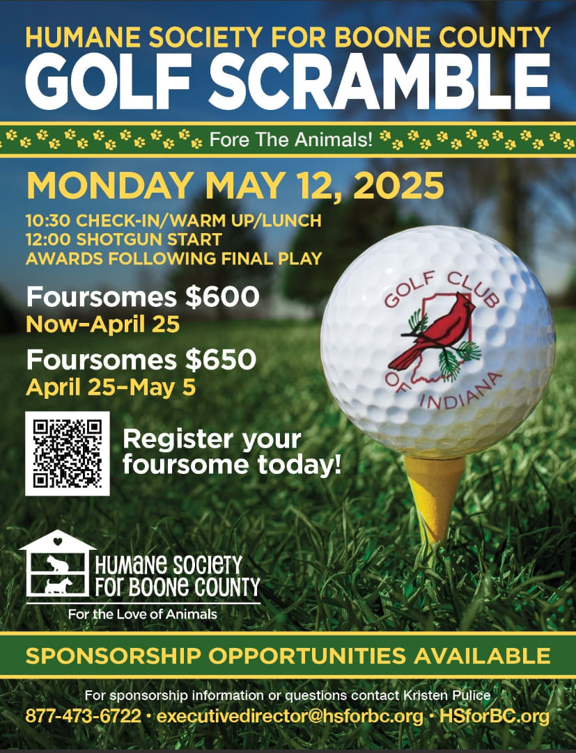 Join Humane Society for Boone for on course hole contests, try to hit a hole in one for an experience of a lifetime, and enjoy a great day of golfing with friends to support the needs of homeless dogs and cats cared for by the Humane Society for Boone County. Play 18 holes, grab a tasty lunch, a post-play snack, and have fun bidding on some great silent auction items! Whether you are a duffer or a scratch golfer, you will have fun on the golf course while helping HSforBC raise funds to provide veterinary care, food and shelter for homeless pets in Boone County awaiting their furever homes. For more information about ways to support this fundraiser, please explore here: https://www.hsforbc.org/golf-scramble.html.Images