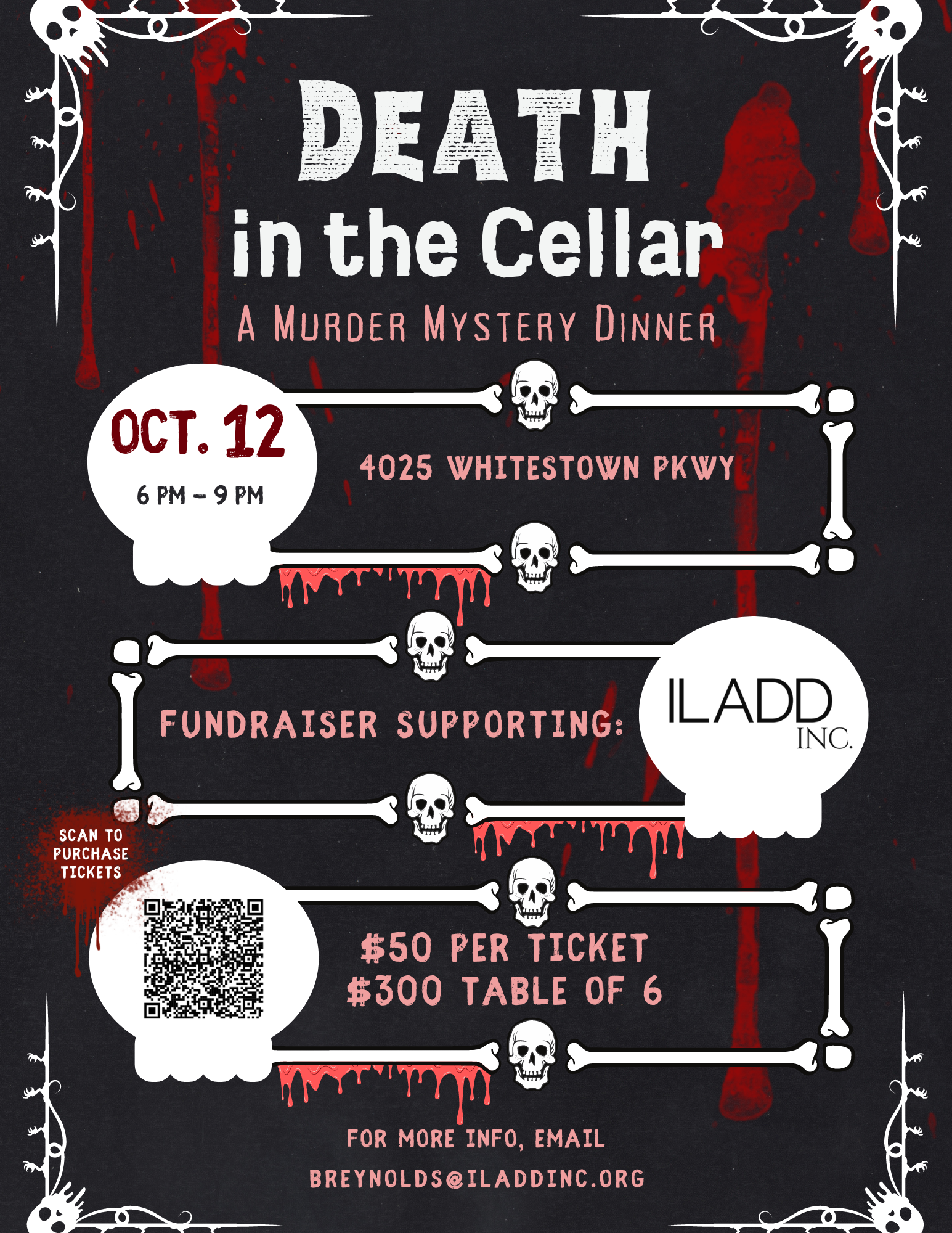 "Death in the Cellar" A murder mystery dinner at ILADD's Sunshine Barn. All proceeds from the event will benefit ILADD! Dinner and soft drinks will be provided with ticket, table or sponsorship. Wine will be available for purchase. Register here -->https://iladdinc.networkforgood.com/events/72770-death-in-the-cellar-a-murder-mystery-dinner