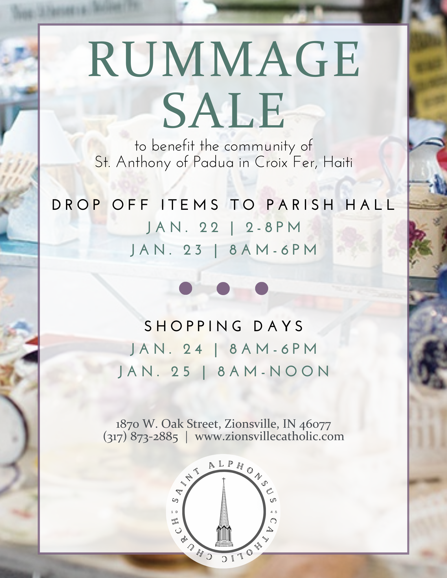Rummage Sale Shopping Days: Friday, January 24, 2025, 8:00 AM – 6:00 PM Saturday, January 25, 2025, 8:00 AM – 12:00 PM