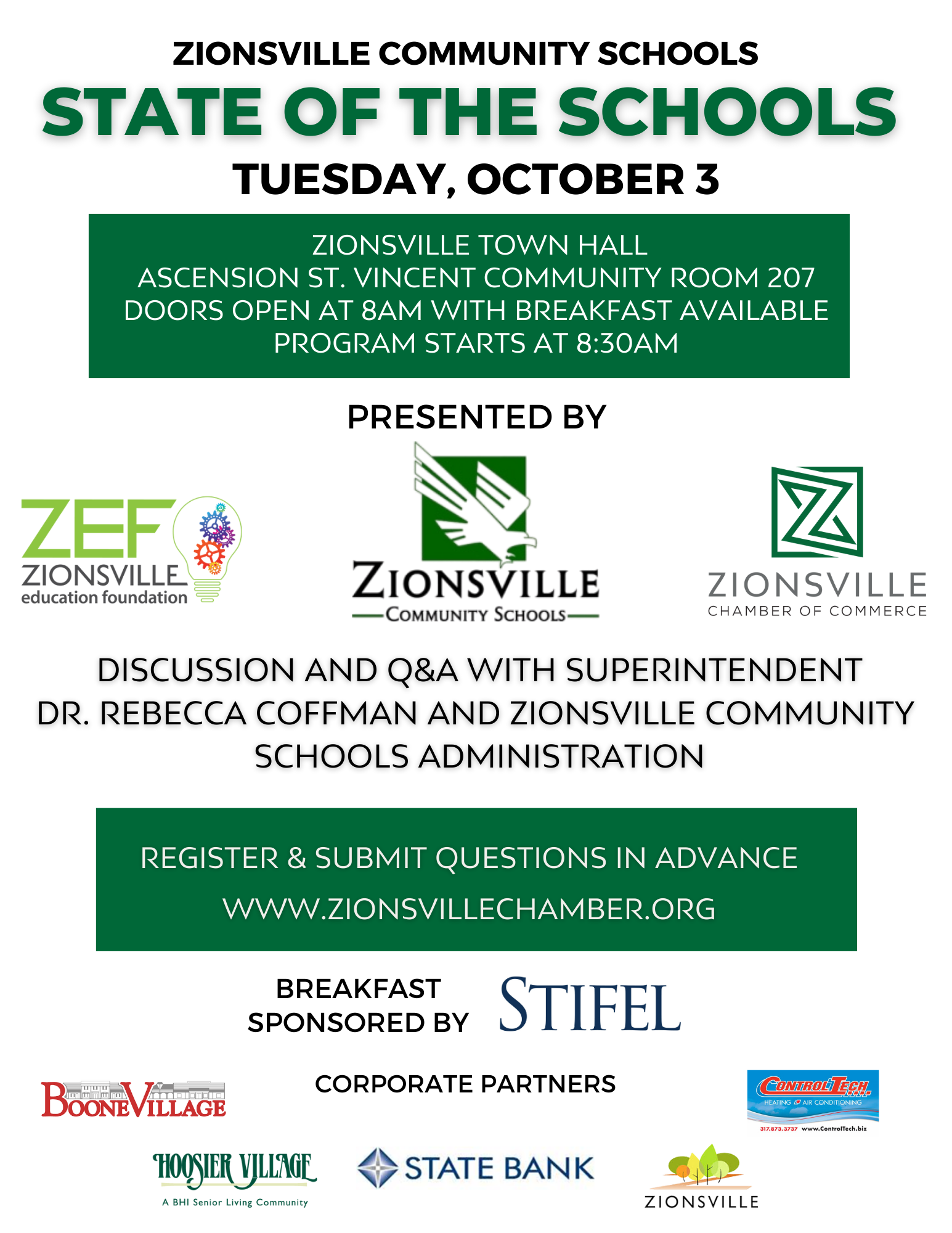 The Zionsville Chamber of Commerce is partnering with Zionsville Community Schools and the Zionsville Education Foundation for a discussion and Q&A session with Superintendent of Schools Dr. Rebecca Coffman and the Zionsville Community Schools Administration.