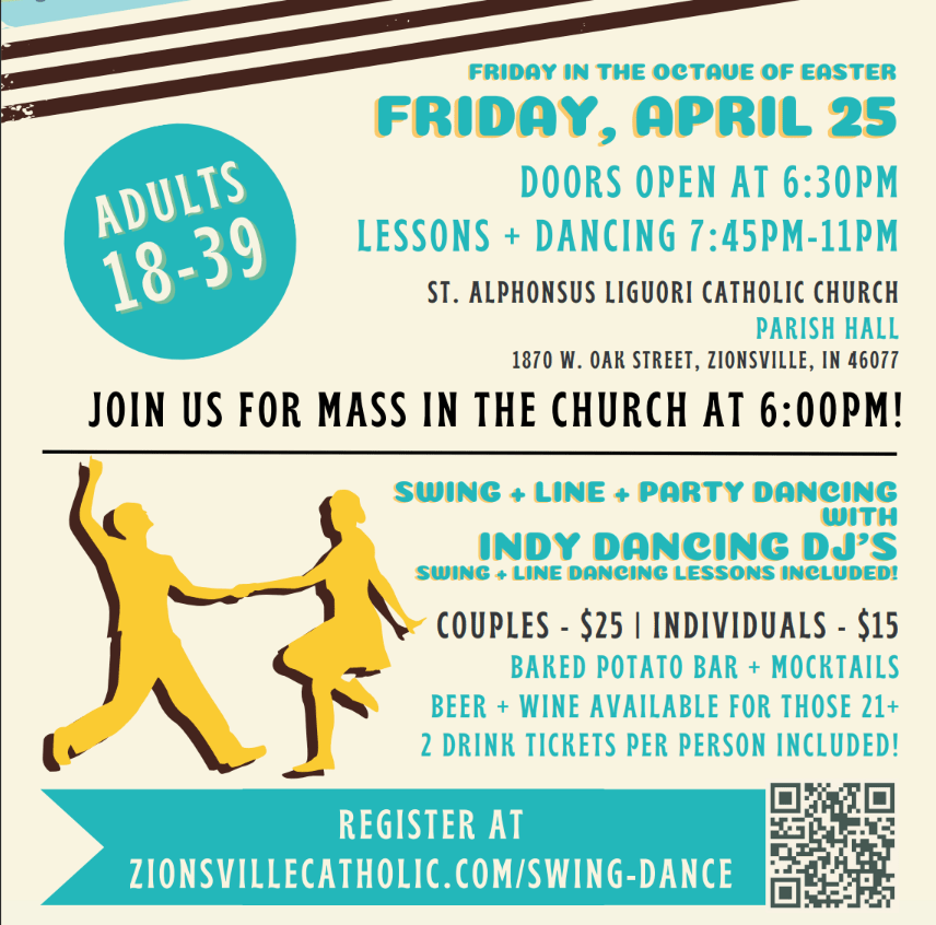 - Tickets: $15 Individual/$25 Couple: https://zionsvillecatholic.com/swing-dance